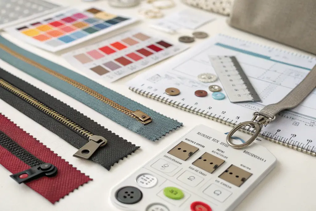 Trims seem small, but they have a huge impact. Every zipper, button, drawcord, and label needs its own specification. For a zipper, this means listing the type (e.g., separating), material (e.g., metal, plastic), size (e.g., #5), and color. For labels, you must provide the exact material (e.g, satin, cotton), size, and printing method. A common mistake is forgetting to specify the care label content. We often receive tech packs with the main label artwork but no instructions for the wash care symbols and text. This causes a last-minute scramble and risks non-compliance with regional regulations, such as those from the Federal Trade Commission.