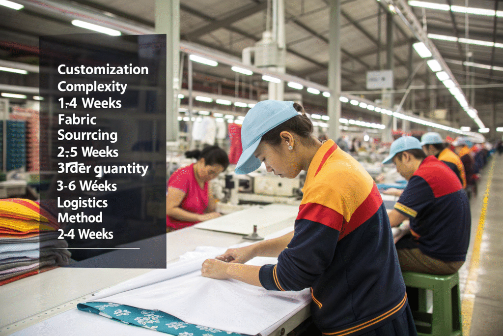 The primary timeline factors include: customization complexity (1-4 weeks), fabric sourcing (2-5 weeks), order quantity (3-6 weeks production), and logistics method (2-4 weeks). These elements combine to create the 8-14 week standard range. A recent case with an Australian activewear brand illustrates these variables: their custom fabric development added 3 weeks, complex printing added 1 week, but their use of established manufacturing patterns saved 1 week, resulting in an 11-week total timeline from order confirmation to delivery in Sydney.