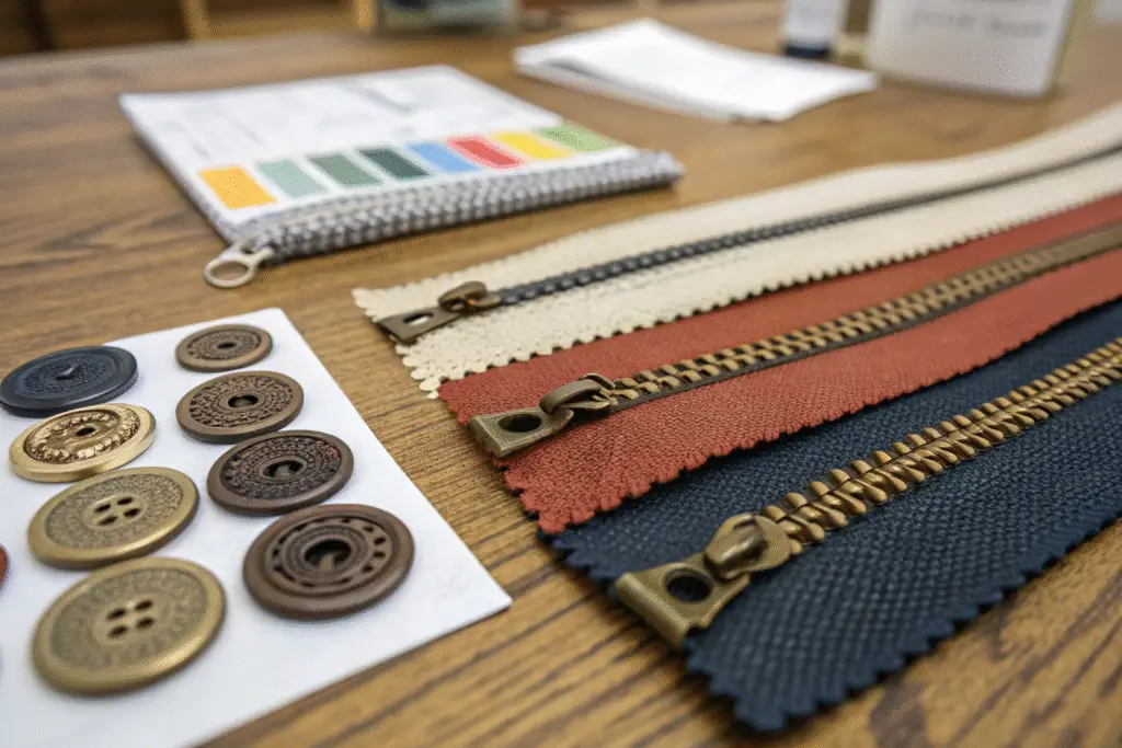 Order multiple trims. We helped LA jacket brand. Buttons 2,000 + zippers 1,000 + labels 3,000. Total volume high. MOQ per item down 40%. Read bulk sourcing trims. Bundle smart.