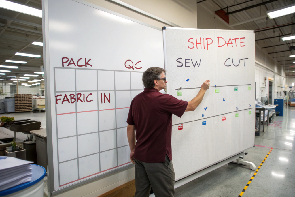Most factories schedule forward. They start with "fabric arrives Monday" and then estimate, loosely, when cutting, sewing, and packing will finish. The delivery date is a hopeful calculation, not a fixed commitment. When fabric arrives two days late, every downstream step shifts, and no one recalibrates the final date until it is too late. This forward-scheduling mindset is the root cause of almost every late shipment I have witnessed.