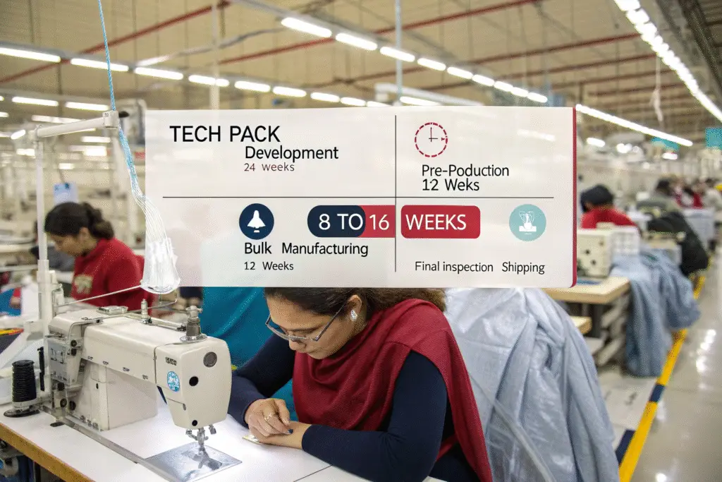 The complete timeline from tech pack to finished garments typically spans 8 to 16 weeks, divided into four key phases: development (2-4 weeks), pre-production (1-2 weeks), bulk manufacturing (4-8 weeks), and final inspection/shipping (1-2 weeks). The exact duration depends on design complexity, order quantity, and fabric availability.