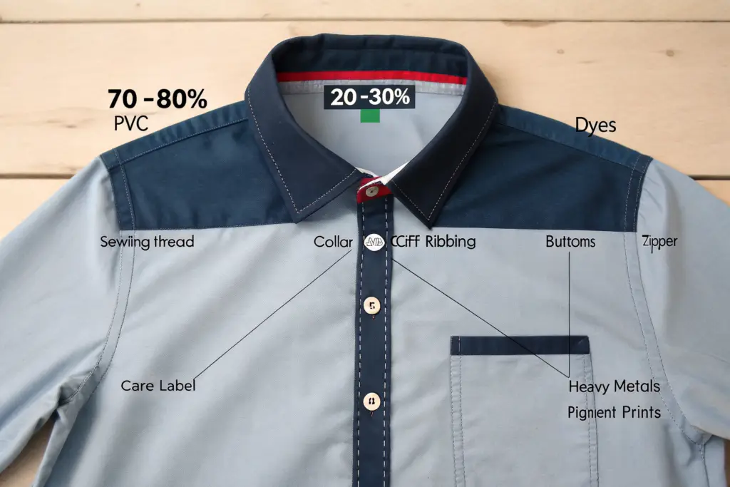The fabric is often only 70-80% of a shirt’s material makeup. The remaining 20-30% consists of what the industry calls “trim” or “sundries.” These include the sewing thread, the collar and cuff ribbing, the buttons or zipper, the care label, and any prints or embroidery. Each of these introduces its own chemical inputs. For example, the dyes in sewing thread, the plasticizers in PVC labels, or the heavy metals in certain pigment prints can all contain restricted substances.