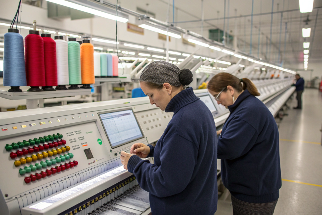 Quality control in knitting starts at the machine. In-house teams perform first-piece inspections on the knitting floor, checking for:
