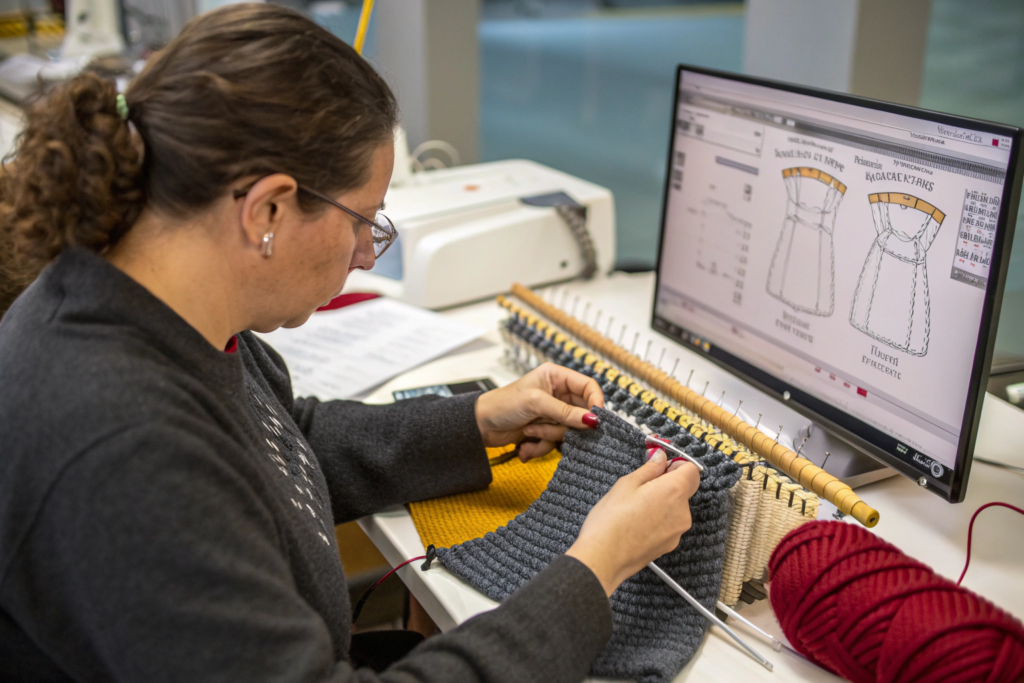 When the knitting team is on-site, a designer can walk over with a new idea, select yarns from the library, and see a swatch knitted within hours. This immediacy fosters creativity and problem-solving. For example, a client wanted a unique “bubble” texture for a dress but found the initial sample too stiff. Our knitting technician was able to adjust the stitch combination and yarn tension that same day and produce a softer, more drapable version by the next afternoon. This agility compressed a typical two-week sampling round into two days.