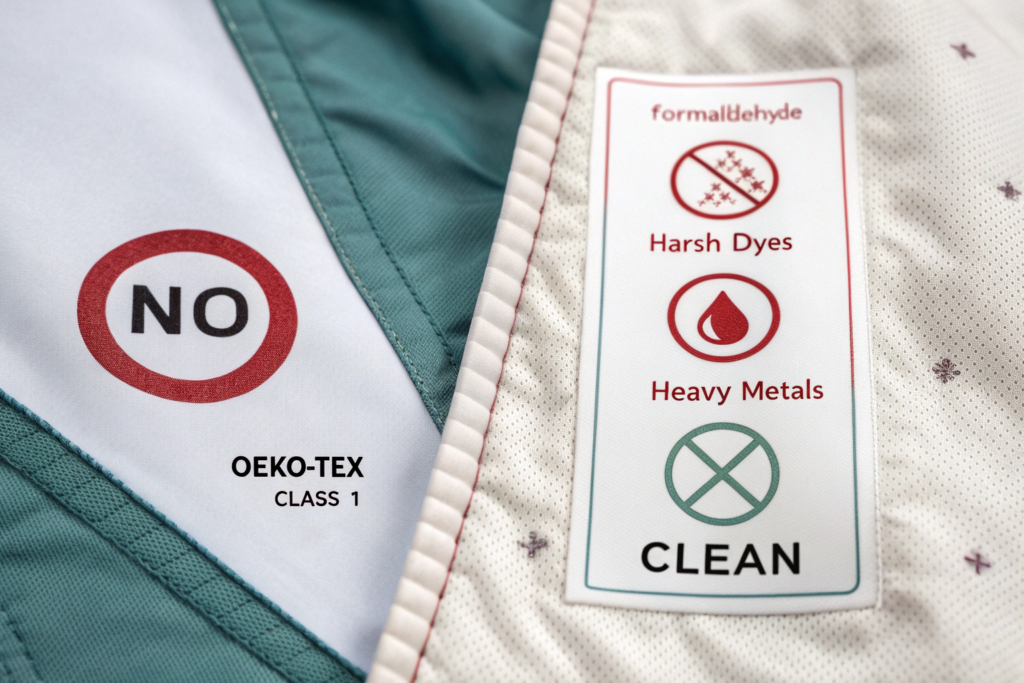 A child's skin is approximately 30% thinner than an adult's and has a higher surface-area-to-body-weight ratio. This makes it more susceptible to penetration and irritation from chemical residues. OEKO-TEX® Class 1 works by setting near-zero tolerance for entire classes of problematic substances.