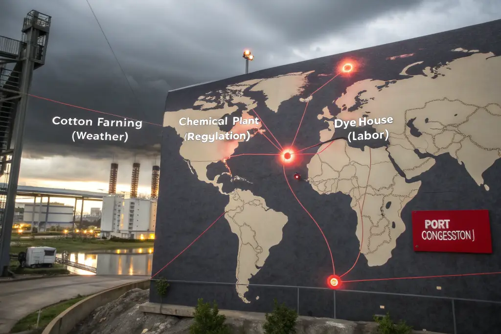 Beyond the predictable timelines and volume constraints, the raw material supply chain is uniquely vulnerable to shocks. These are forces that no factory, brand, or even mill can control. From extreme weather destroying a cotton crop to a chemical plant shutdown creating a shortage of a specific dye, the first mile of the supply chain is the most exposed to global volatility. A single disruption can create a bottleneck that echoes for months.