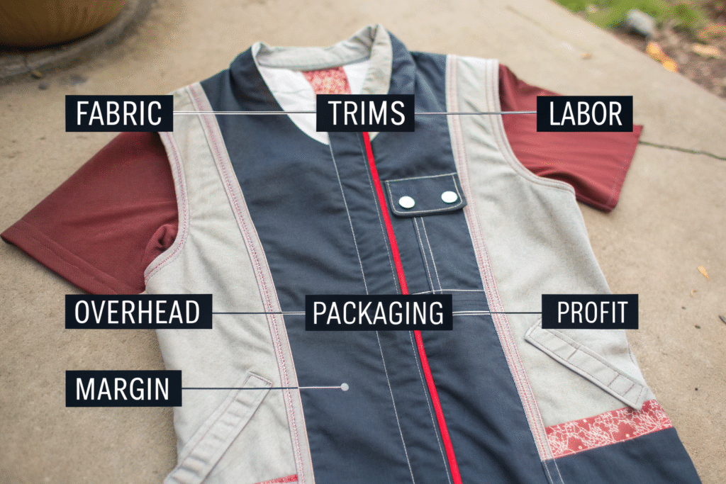 - Trims and closures (zippers, buttons, labels, tags with quantities)