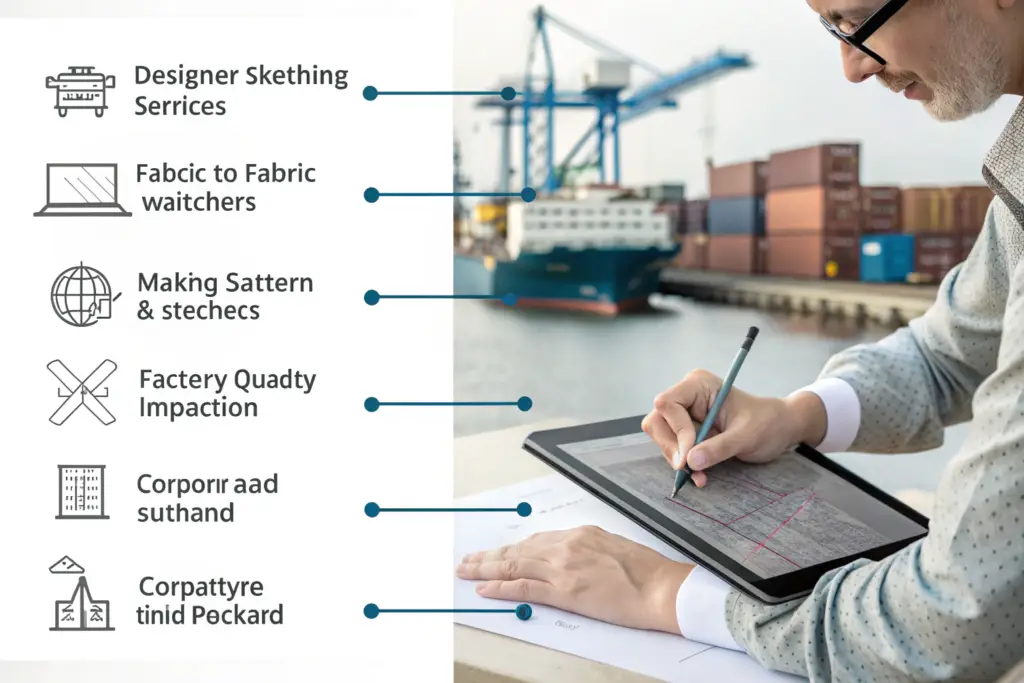 Full package manufacturing includes every single step required to turn your design concept into a finished product delivered to your warehouse. This encompasses design support, pattern making, fabric and trim sourcing, sampling, production, quality control, packaging, and logistics.