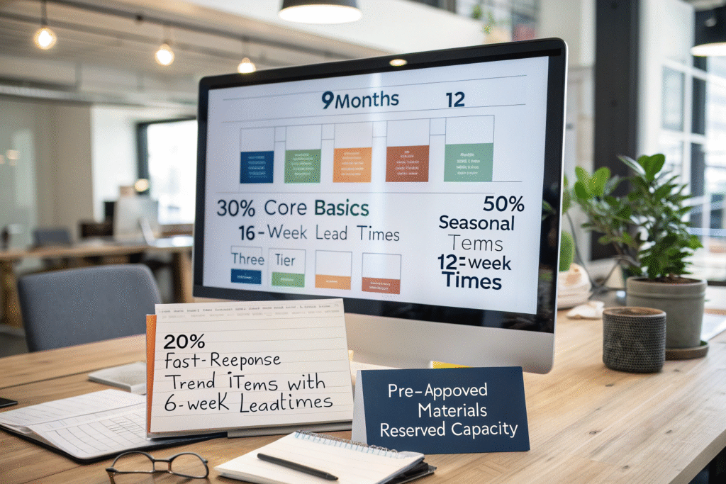 Adapting to extended timelines requires fundamental changes in planning approaches, including: 9-12 month planning horizons instead of 6-month cycles, strategic inventory positioning of core materials, relationship-based capacity reservation, and collection architectures that combine fast-response and planned elements. A contemporary brand we work with has successfully adapted by implementing a "three-tier" collection approach: 30% core basics with 16-week lead times, 50% seasonal items with 12-week lead times, and 20% fast-response trend items with 6-week lead times using pre-approved materials and reserved capacity.