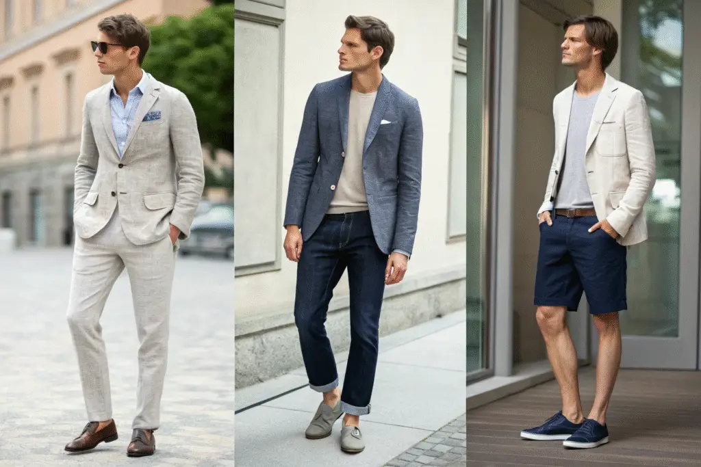 Linen blazers can be styled for various occasions by changing accompanying pieces. For business casual, pair with dress trousers and leather shoes. For smart casual, combine with dark denim and loafers. For summer events, wear over a simple t-shirt with tailored shorts and sneakers. The blazer's texture adds sophistication to even the simplest outfits.