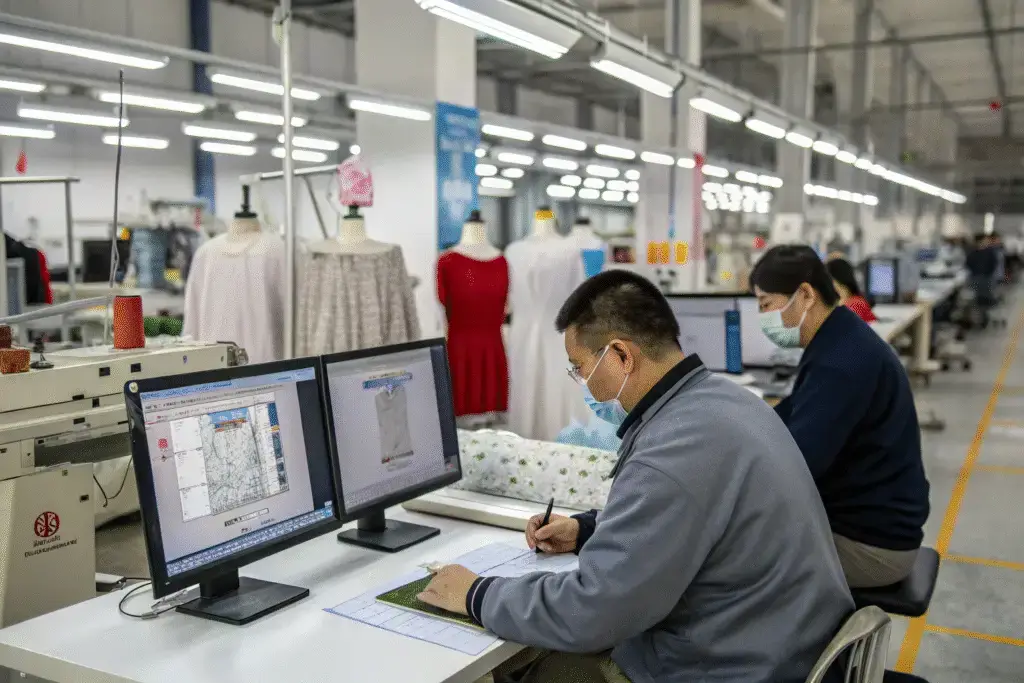 In our factory, we collaborate with brands using AI-driven CAD software to quickly generate precise patterns and size ranges.