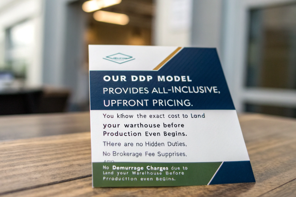 Our DDP model provides all-inclusive, upfront pricing. You know the exact cost to land your goods in your warehouse before production even begins. There are no hidden duties, no brokerage fee surprises, and no demurrage charges due to clearance delays we cause.