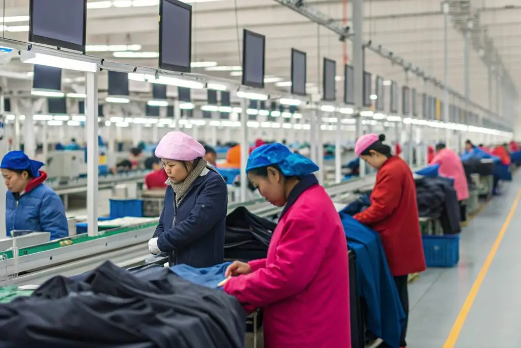 Workers sewing garments in a large-scale factory