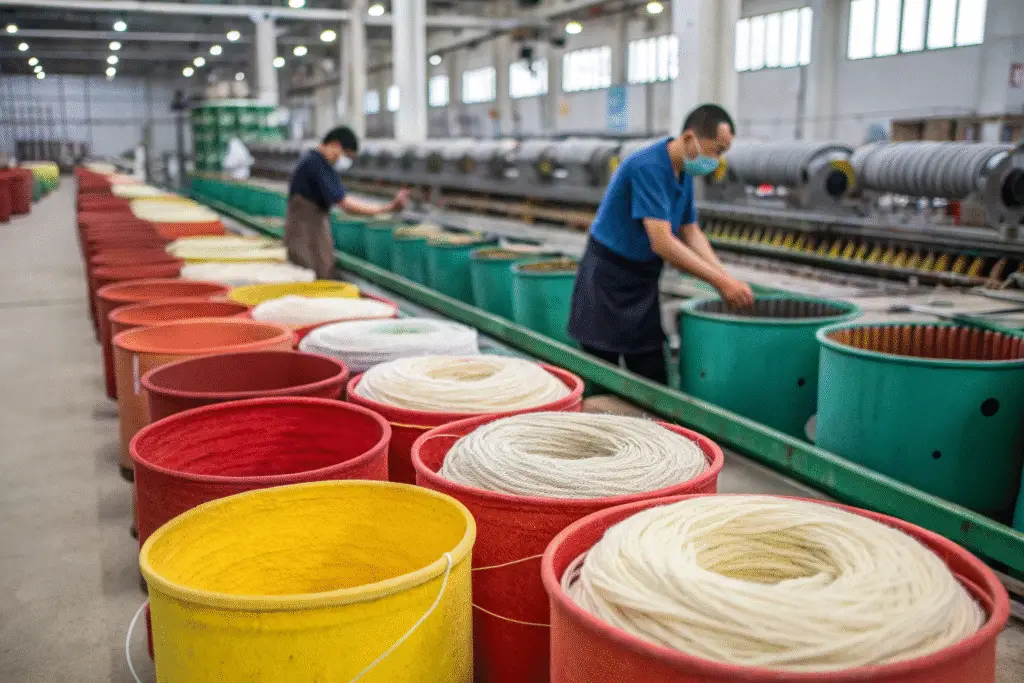 Premium yarn evens dye. Cuts rework 70%. Lines faster.